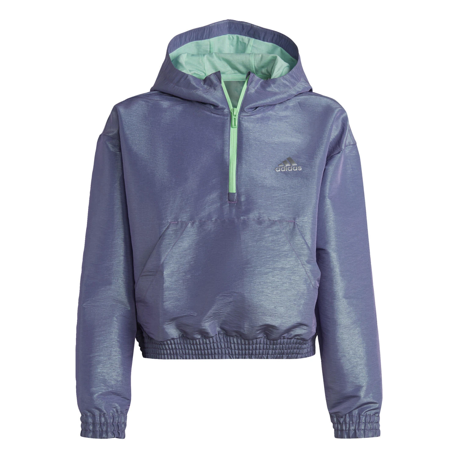 DJ turn the music up. This juniors’ adidas track top has a unique build that shimmers as you move. With its slightly cropped length and slouchy shape, it looks just as good with figure-hugging leggings as baggy track pants. The kangaroo pocket has snap buttons to keep your phone from falling.