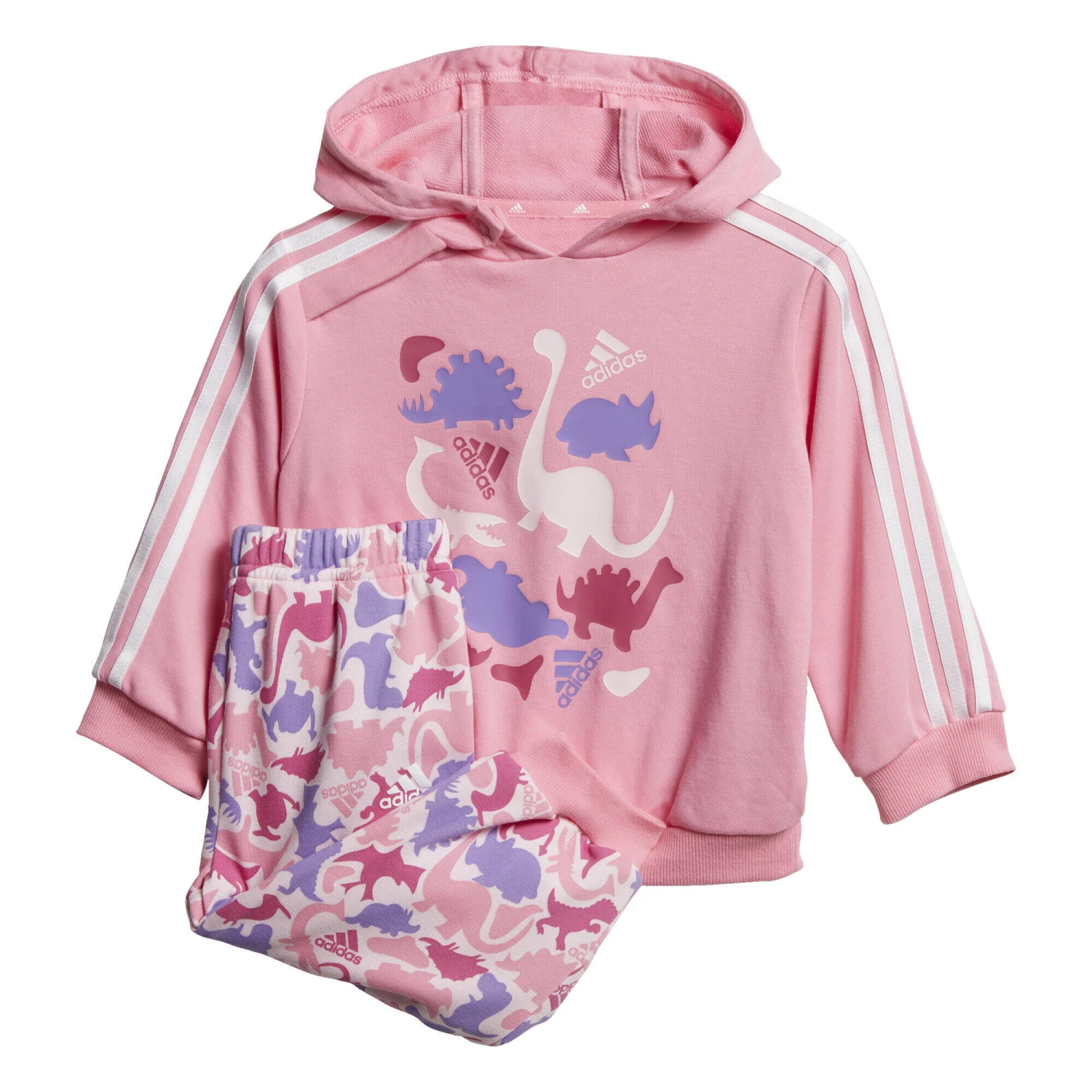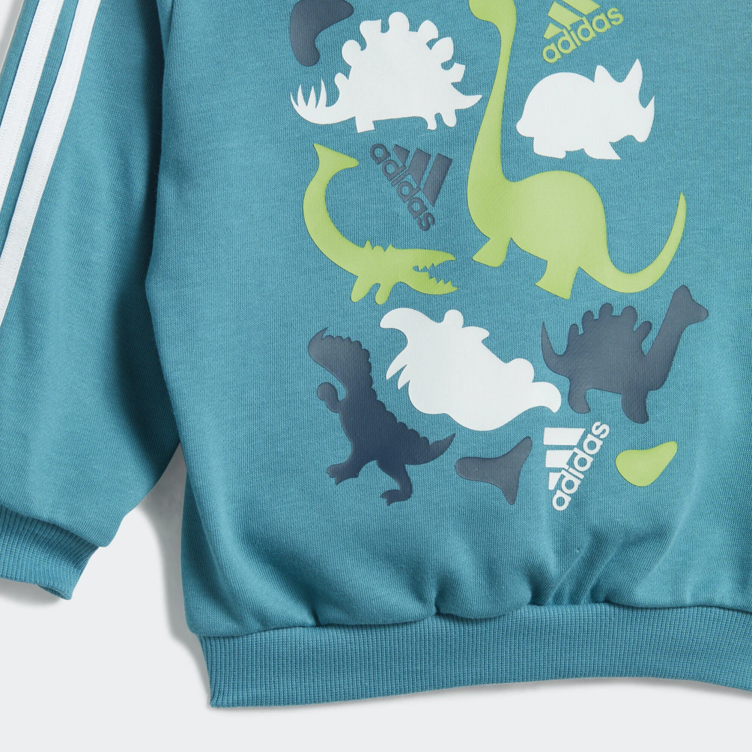Classic and jurassic. Decorated with dinosaurs as well as the 3-Stripes, this infants’ adidas jogger set is made for sporty explorers. Both the hooded pullover and joggers feel really soft. They’re cut in a loose shape to let little ones reach, bend and wriggle, while the pants have a stretchy elastic waistband that pulls on easily and rests gently against little tummies. A minimum of 70% of this product is a blend of recycled and renewable materials. adidas’ cotton products support more sustainable cotton farming.