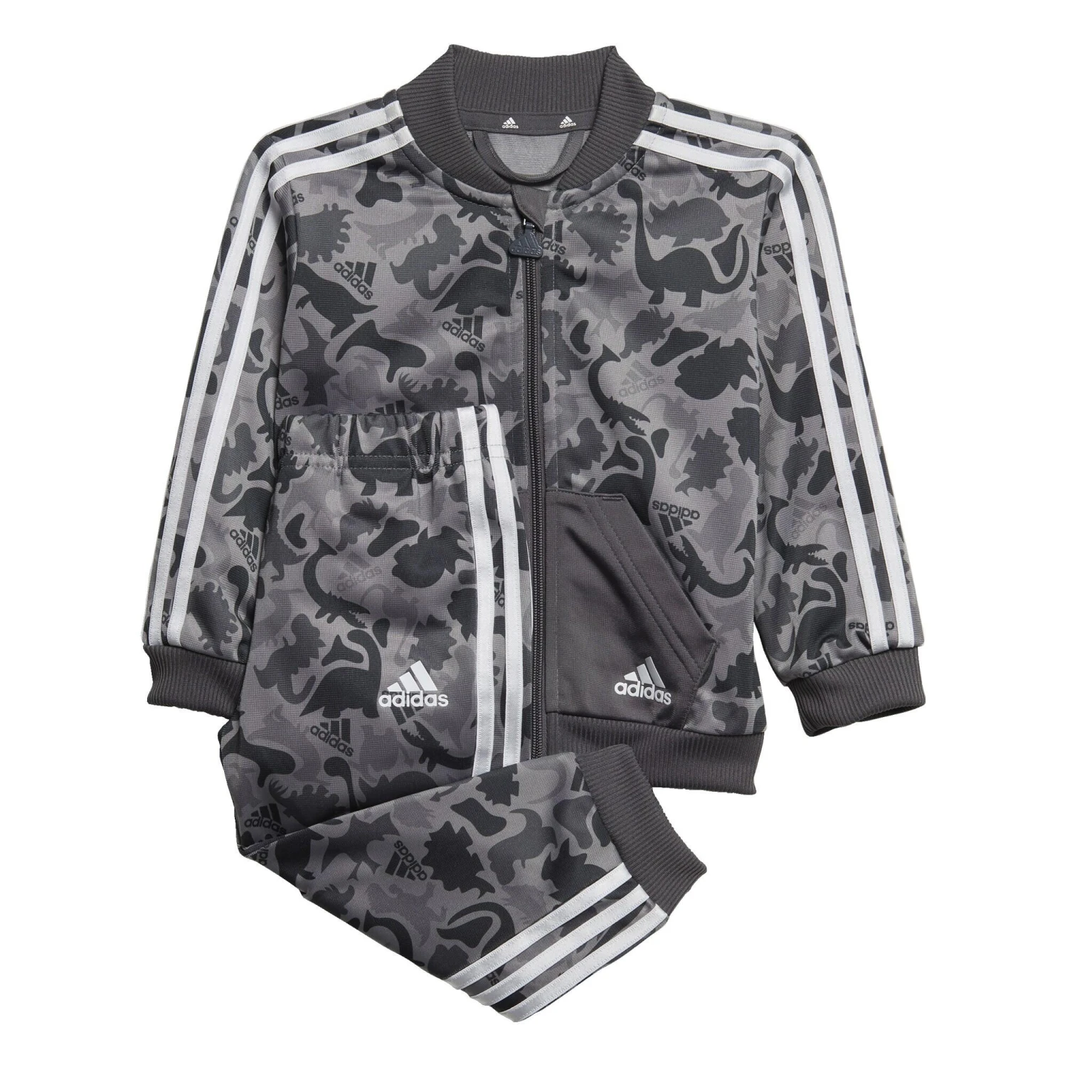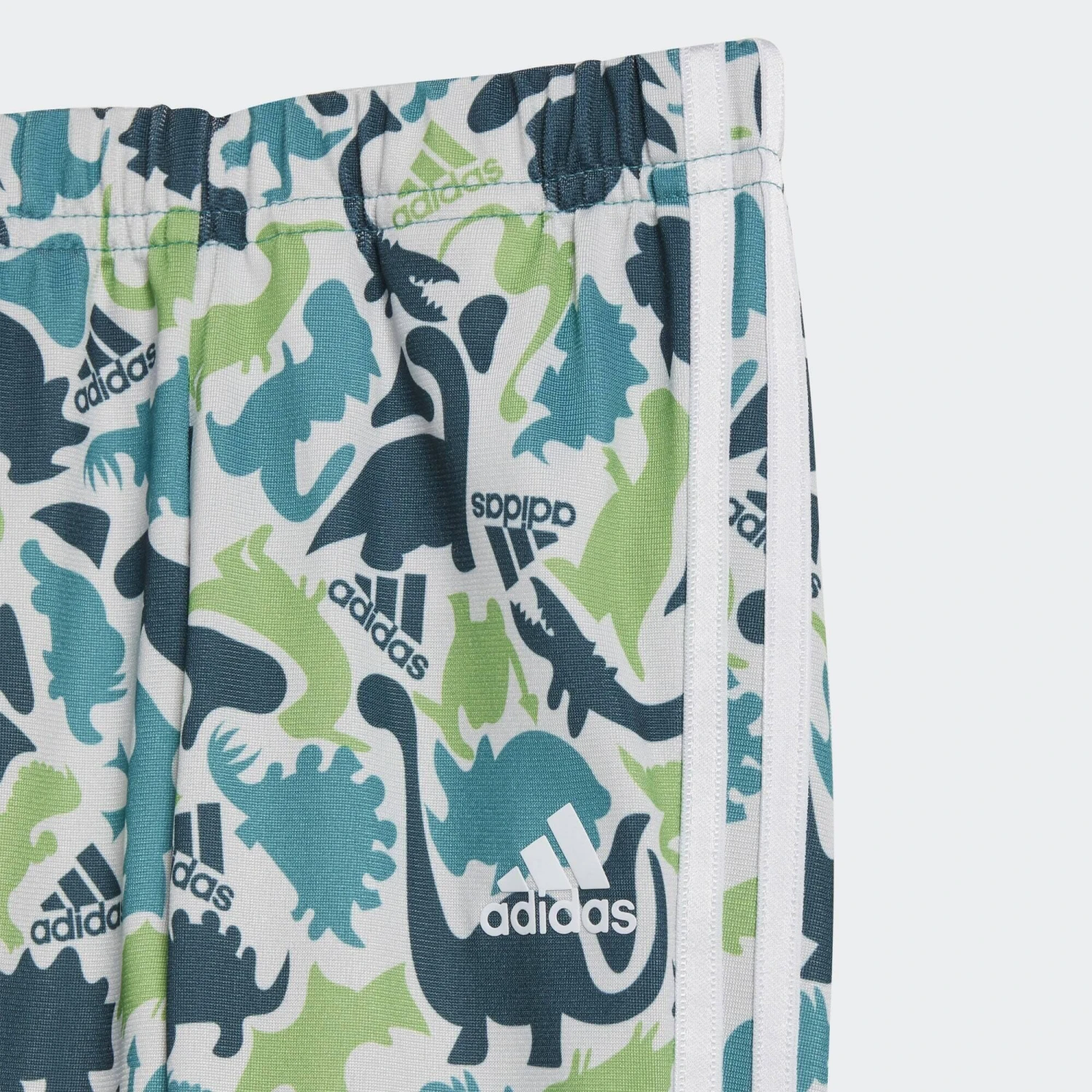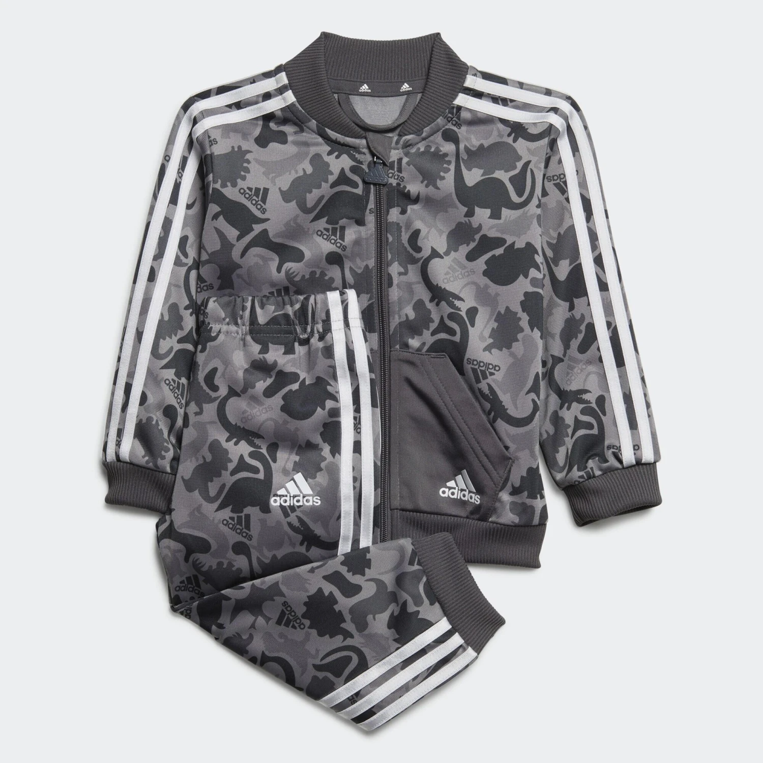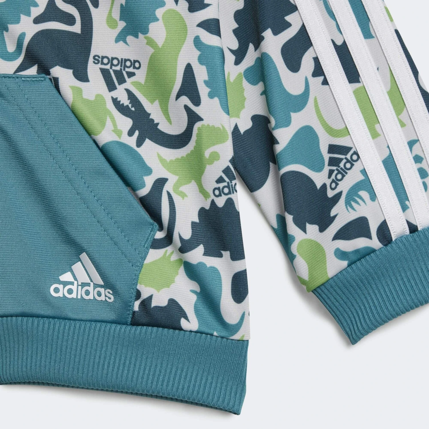 An up-close encounter with this camo print reveals all your infant’s favourite dinosaurs. This infants’ adidas track suit is lightweight and airy, so it’s great for everyday exploring. The easy-on pants are cut for a slim fit through the legs so they tuck neatly into wellies. Made with 100% recycled materials, this product represents just one of adidas’ solutions to help end plastic waste.