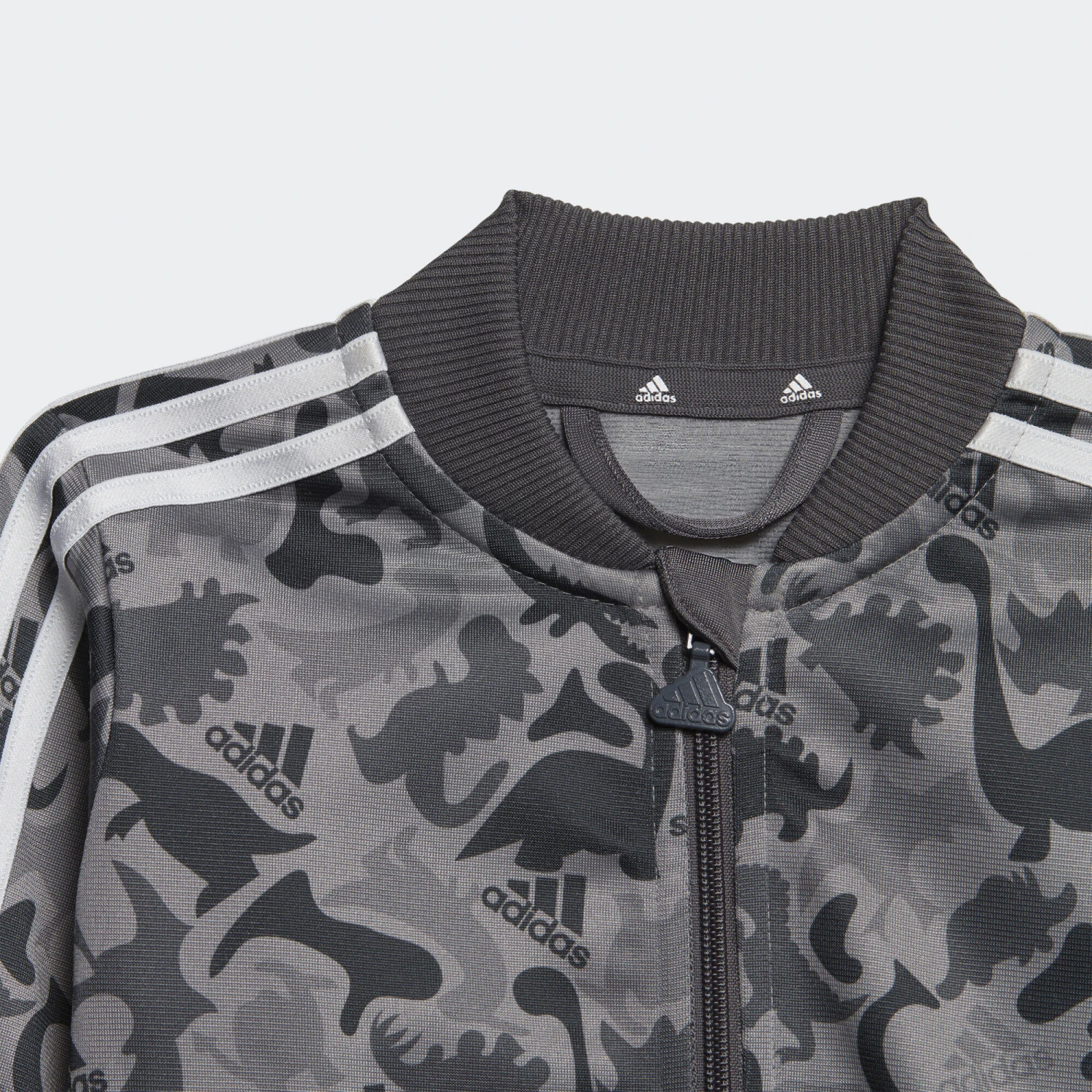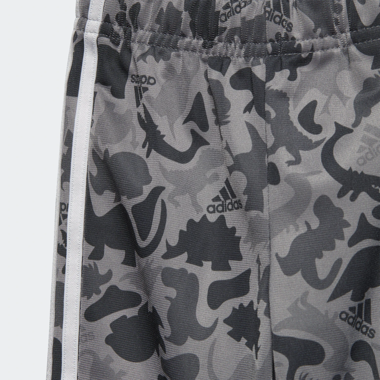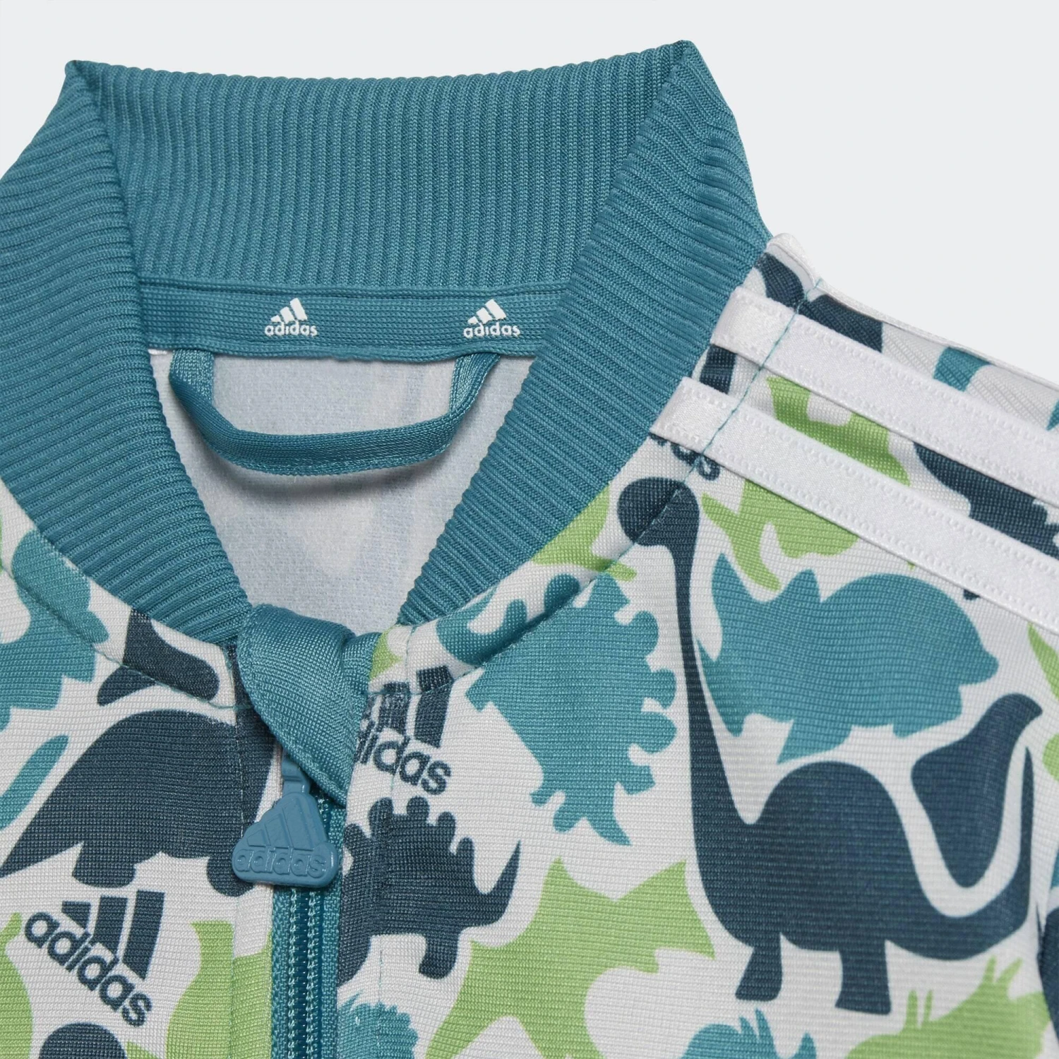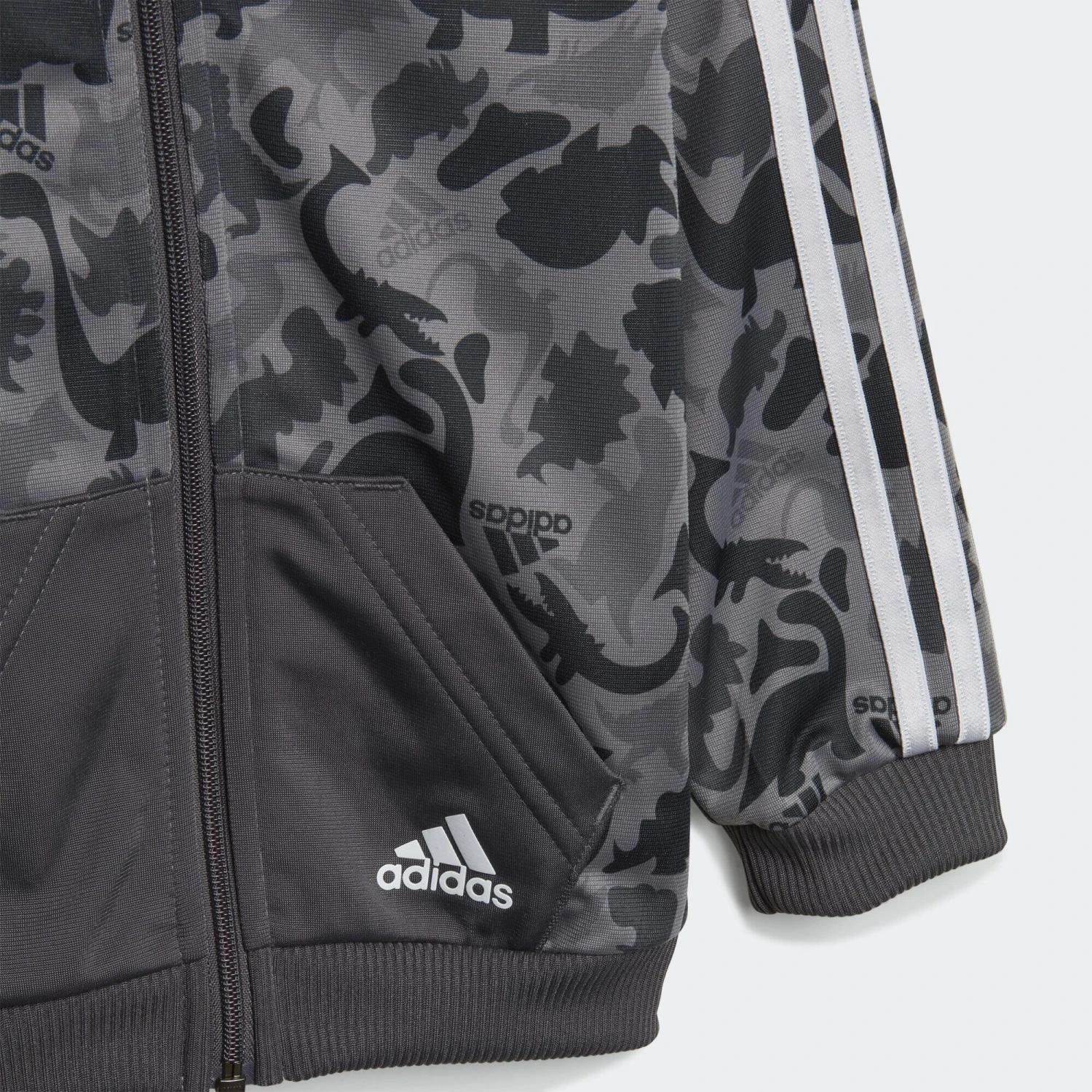 An up-close encounter with this camo print reveals all your infant’s favourite dinosaurs. This infants’ adidas track suit is lightweight and airy, so it’s great for everyday exploring. The easy-on pants are cut for a slim fit through the legs so they tuck neatly into wellies. Made with 100% recycled materials, this product represents just one of adidas’ solutions to help end plastic waste.