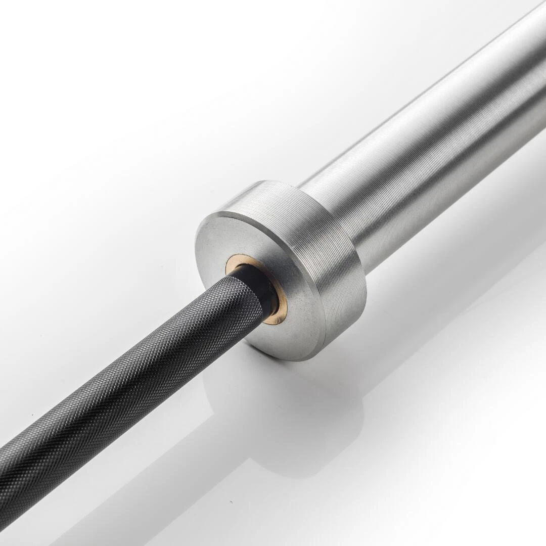 The Team Barbell features a medium-depth knurl, striking an excellent balance between providing good grip but without tearing up your hands on high-rep workouts. Microgrooves on the sleeves prevent your loaded plates from slipping, and a combination of needle and ball bearings in the collars gives a smooth, reliable spin. Bushings set inside the inner and outer ends of the collar protect those bearings from heavy, repetitive impacts.