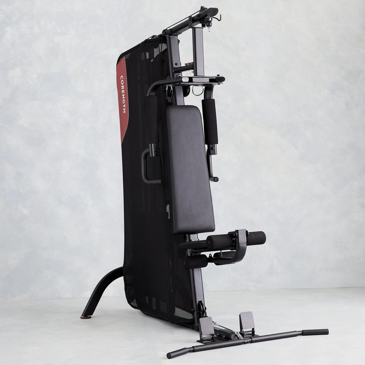 – The footrests can be folded for horizontal pulling.The bonus? You can work all your muscles for a footprint of less than 2 m2 in use, and even less once the product is folded away.