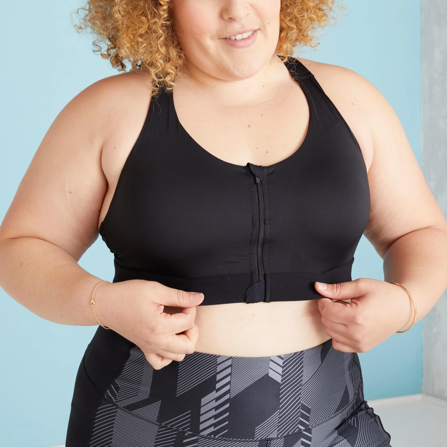 We designed this fitness sports bra for high-impact training: HIIT, cardio circuits, jumping, body attack. It is available in sizes XS to 5XL.e opted for a front zip to make this sports bra easy to put on. With adjustable straps and built-in foam padding, it’s comfortable and suitable for larger cup sizes (XS to 5XL).