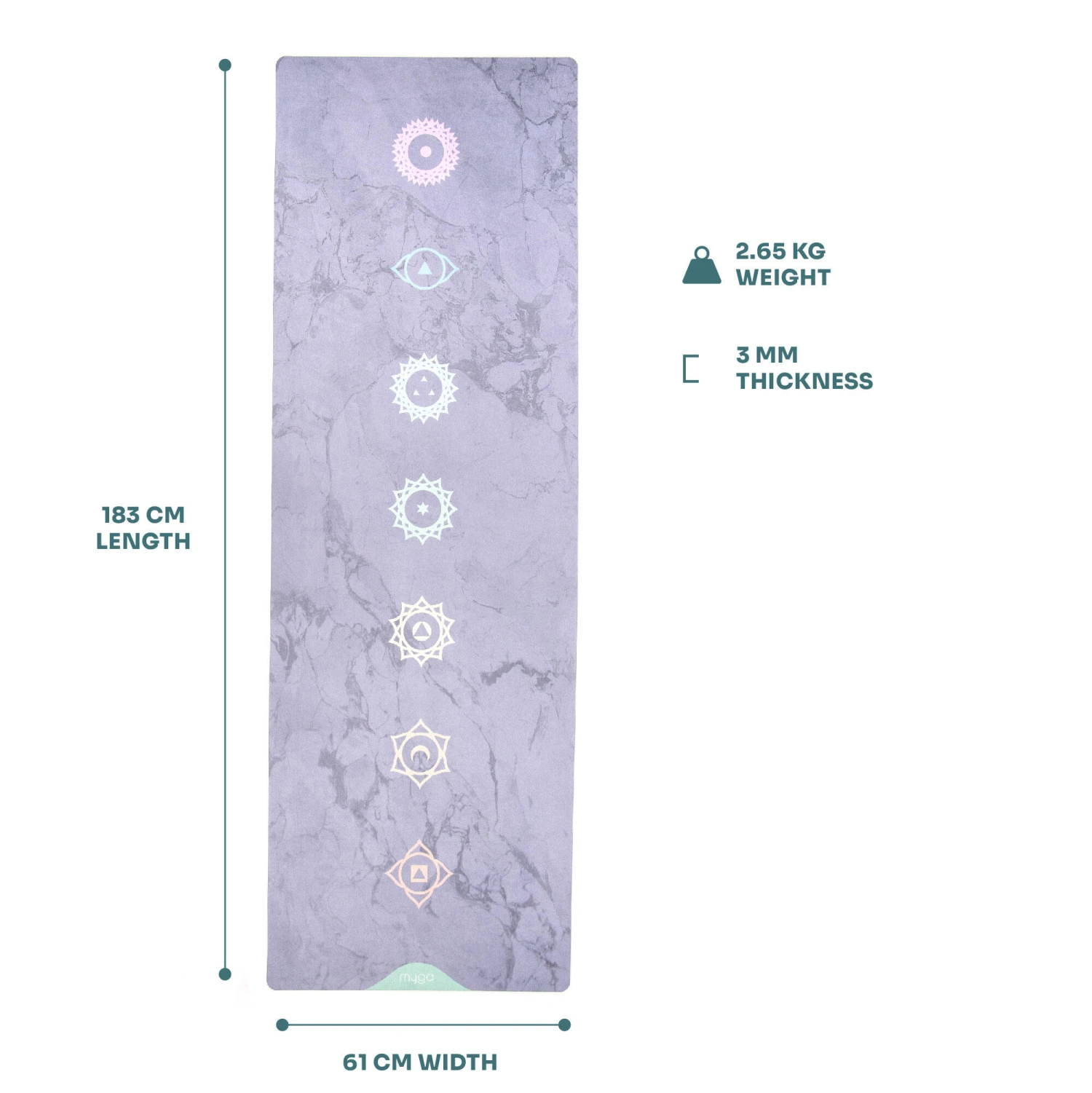 Based on holistic philosophy, your energy body (or aura) contains seven main chakras each one with different features and characteristics. Beautifully designed to help you find your space and remember your true nature this stylish mat is has a soft vegan suede top layer, delicate on touch and a rubber tree bottom providing stability on any surface.
