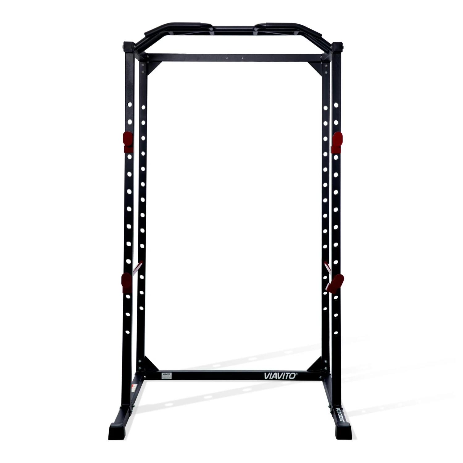 Great for developing functional strength and building muscle, the Viavito PC1000 GT power cage offers 14 height settings, 2 x adjustable spotter bars, 2 x robust barbell rests and a pull up station.