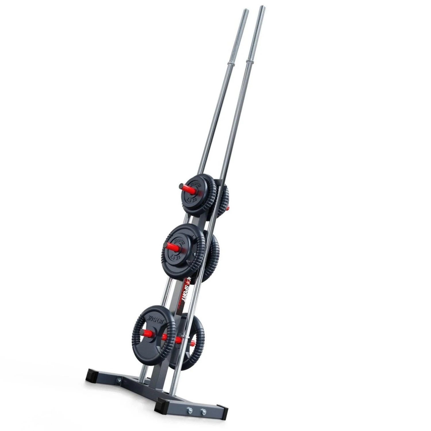 With our sturdy weight rack tower you will maintain order in your home gym. You can easily store your weight plates and barbell bars on one weight plate stand.