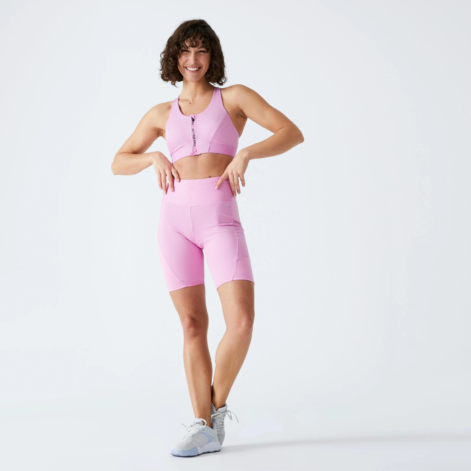 High-waisted cycling shorts to provide support and comfort during all your workouts.For the past several seasons, bike shorts are back. With their length just above the knee, they combine two materials for even greater comfort. They go perfectly with the cropped T-shirt in the same range.